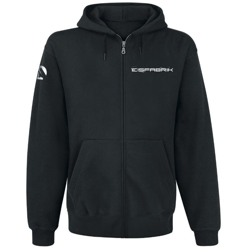 Schwarze Kapuzenjacke mit Reißverschluss, dem markanten EISFABRIK-Logo auf der Brust und einem zusätzlichen Motiv auf dem Ärmel. Bequemer Schnitt, angenehm zu tragen und ideal für Alltag, Clubnächte oder Konzerte. Ein zeitloses Essential für Fans – minimalistisch, dunkel und unverkennbar EISFABRIK.